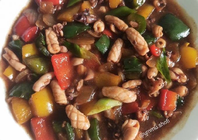 Cumi Lada Hitam ala Restoran cumi segar air jeruk nipis paprika merah kuning hijau potong dadu bawang bombay potong kotak bawang putih cincang kasar lada hitam garam saos tiram. 2 paprika merah besar. Tambahkan saus tiram kecap manis saus tiram dan merica bubuk aduk hingga rata.